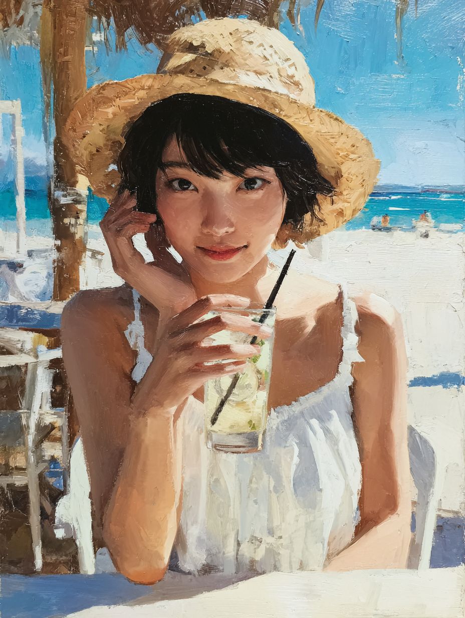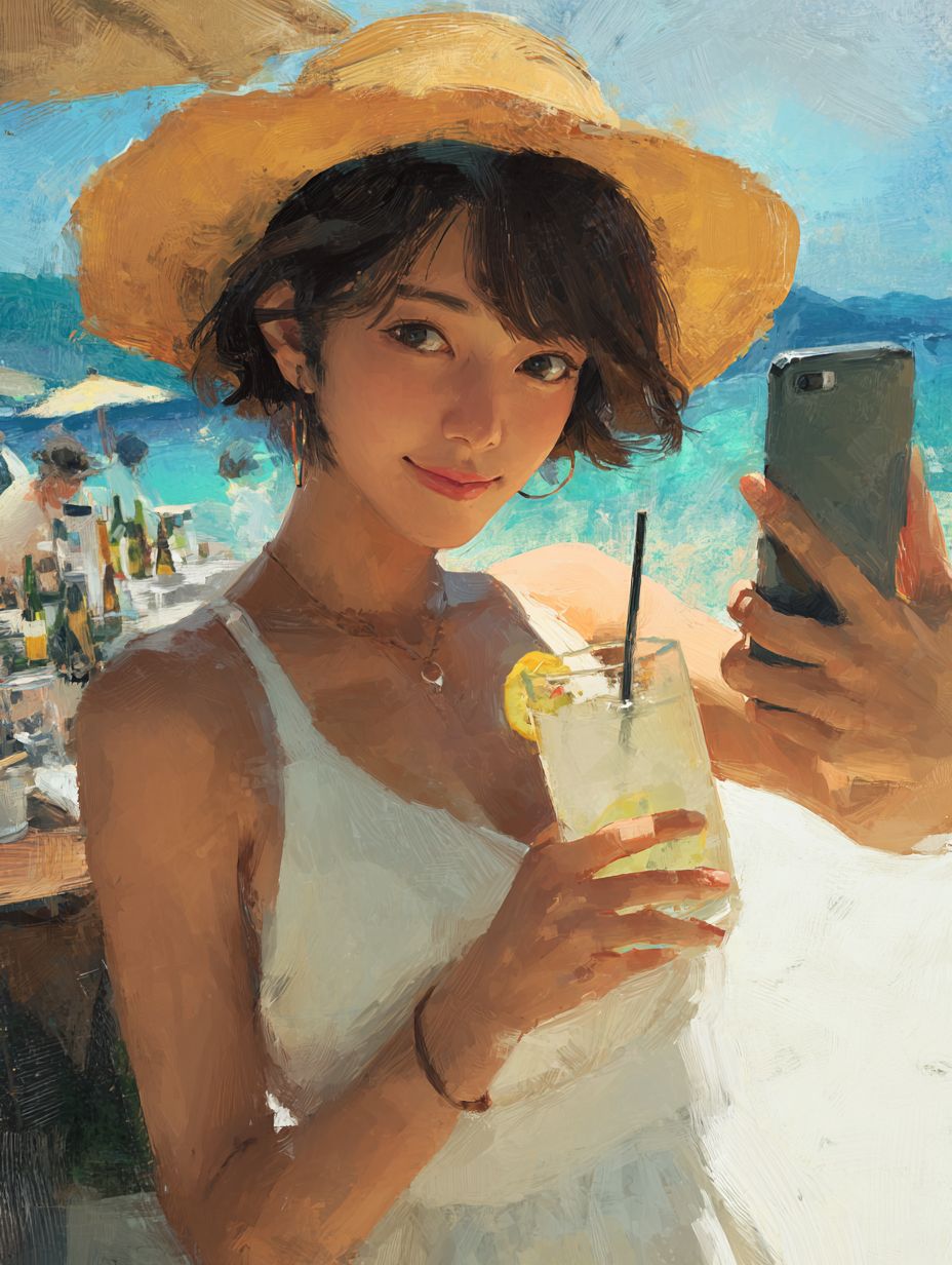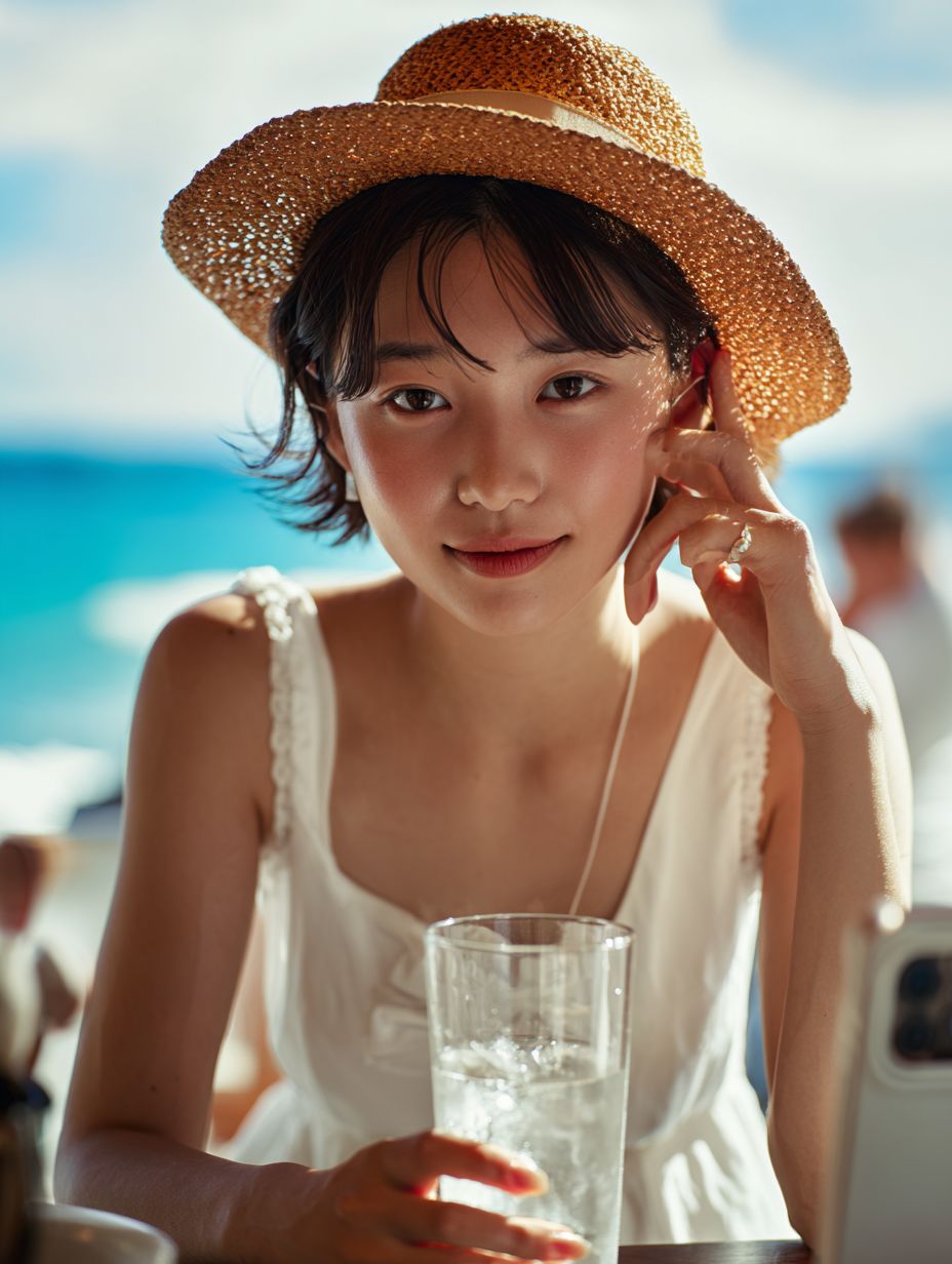 Une photo de haute qualité d'une femme japonaise attrayante avec des cheveux courts, vêtue d'une robe d'été blanche et d'un chapeau de paille, buvant un highball de shochu dans un café en bord de mer. Son expression douce est capturée avec un smartphone.