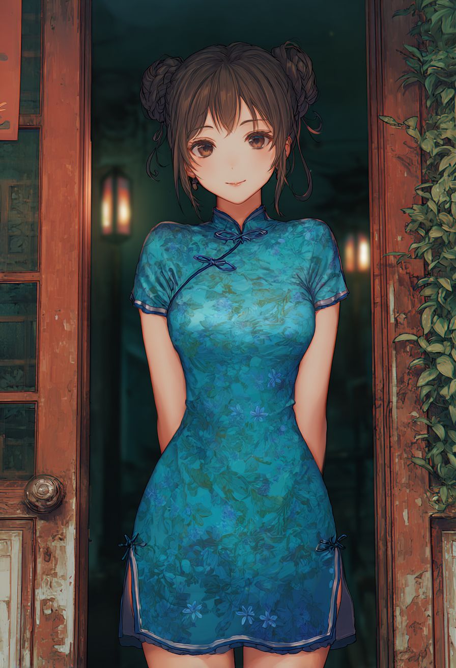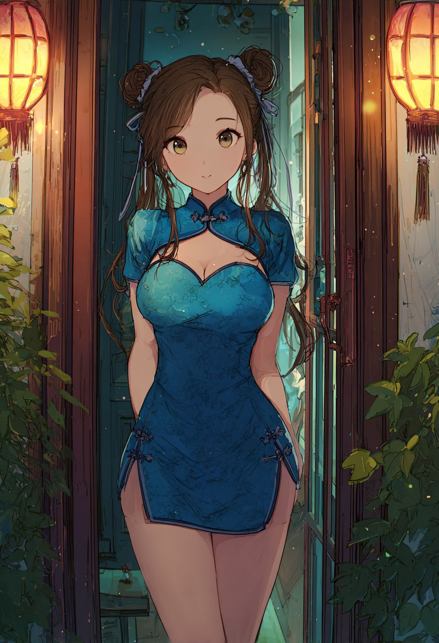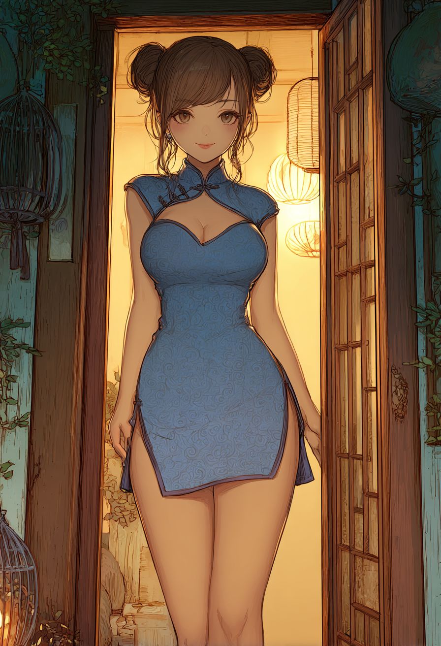 可愛いアニメスタイルのイラストで、美しい少女が青いチャイナドレスを着て、頭の両側に2つの丸髪を持ち、大きな目と完璧な体型で、夜の家の中に立っています。高品質で豊かな詳細を持つ傑作で、魅力的でかわいらしい外見と素敵な笑顔を持っています。