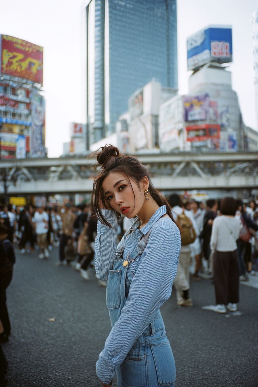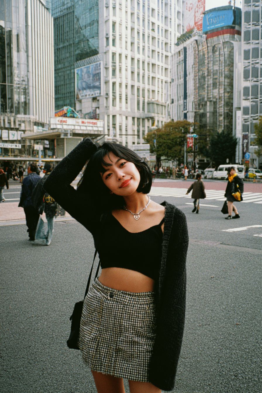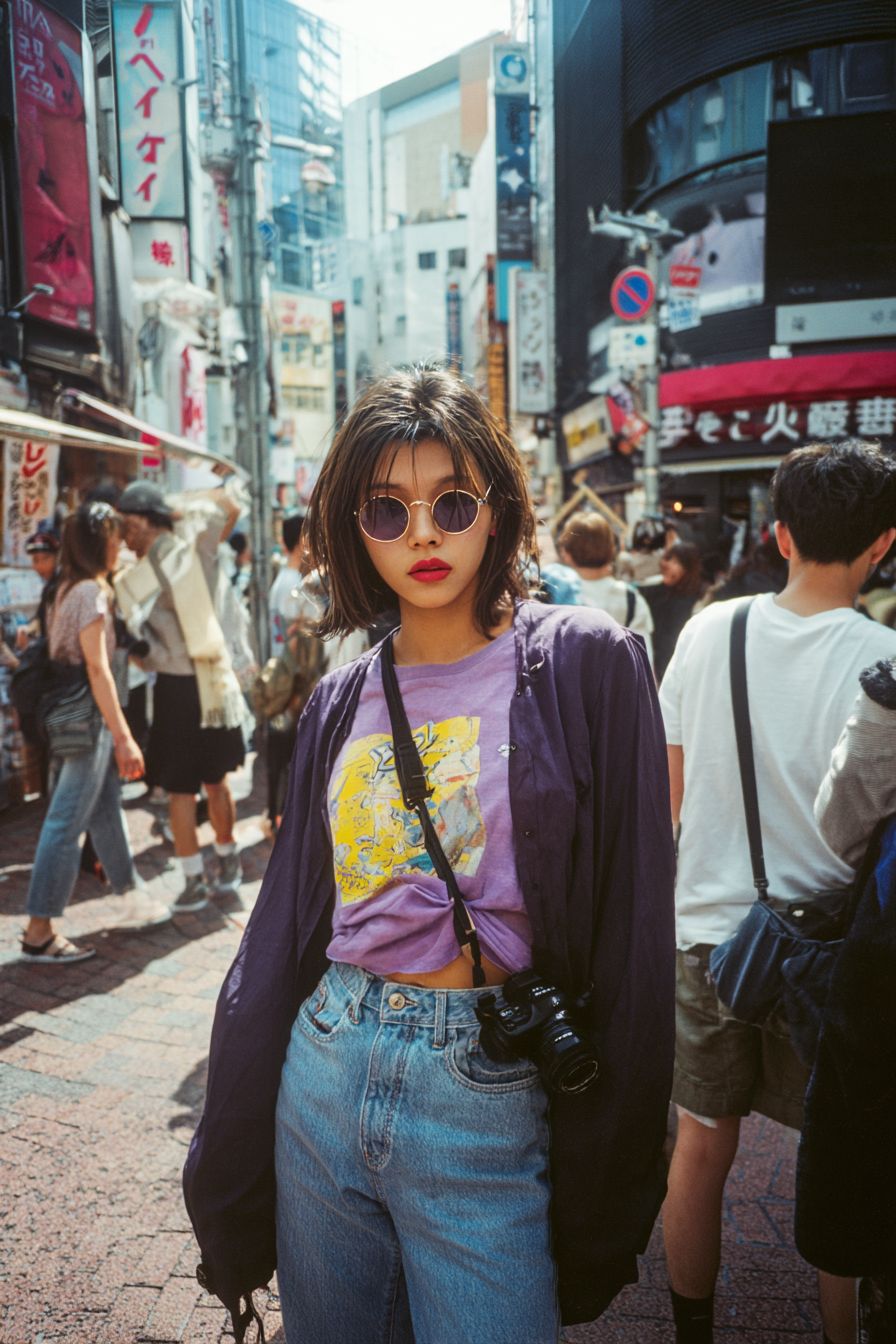 인플루언서 스타일로 인생을 즐기고 있는 젊은 일본 여성의 사진. 도시 스타일의 중앙에서 코닥 포트라 중형 필름 카메라로 촬영된 레트로 패션, 쿨한 포즈, 80년대 헤어스타일, 빈티지 사진 질감.