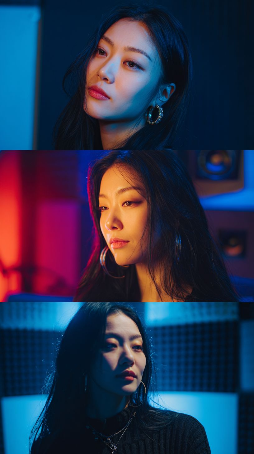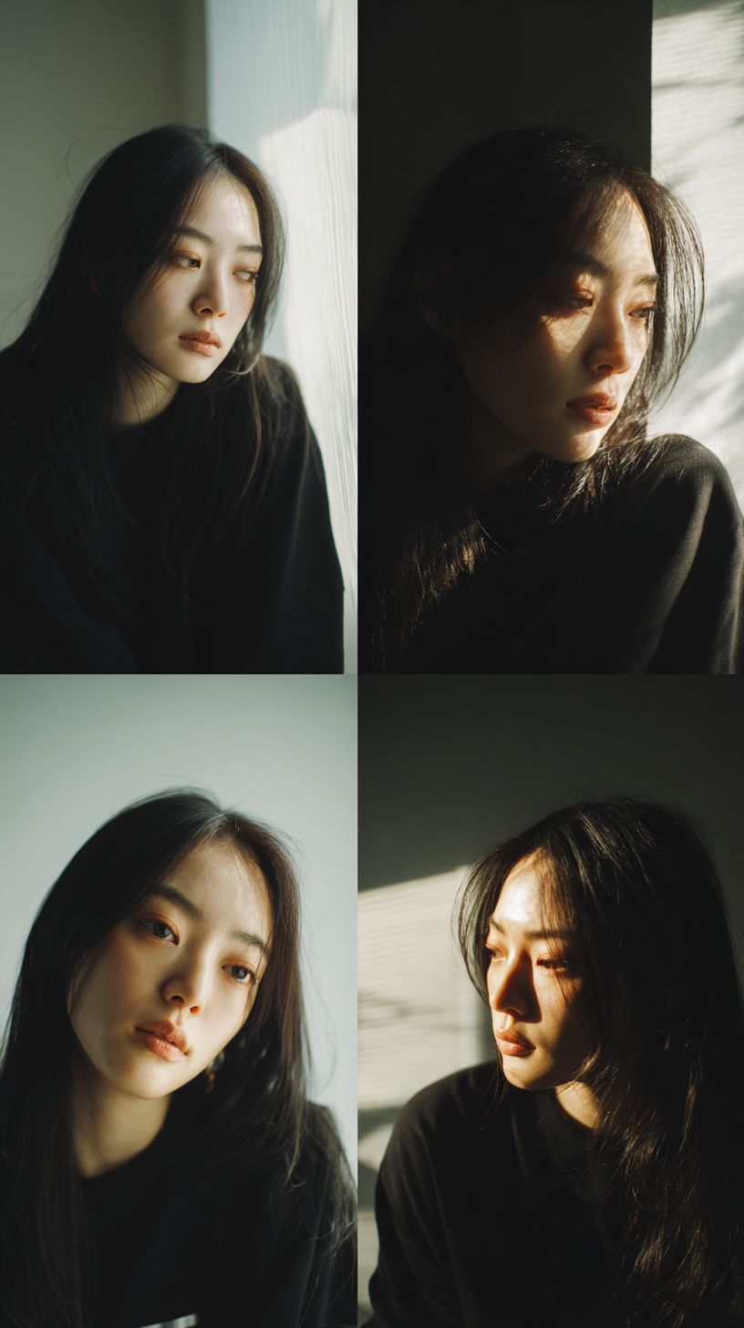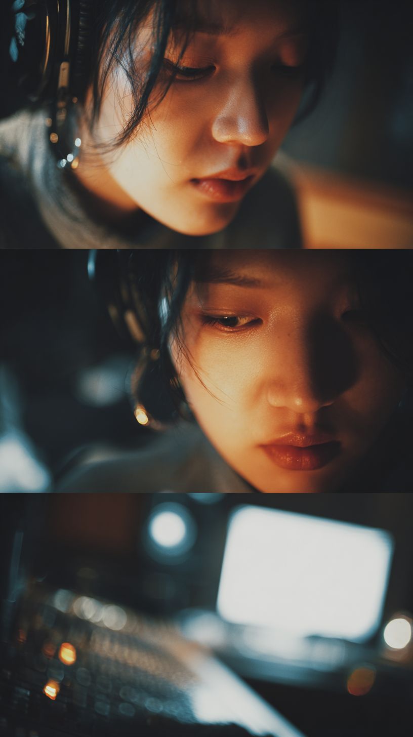 Sessões de Estúdio Modernas, uma jovem coreana com belos olhos gravando baladas poéticas e emocionais. Cada painel mostra um momento diferente de libertação emocional, exibindo um estilo único e configurações de estúdio que refletem suas mudanças internas.