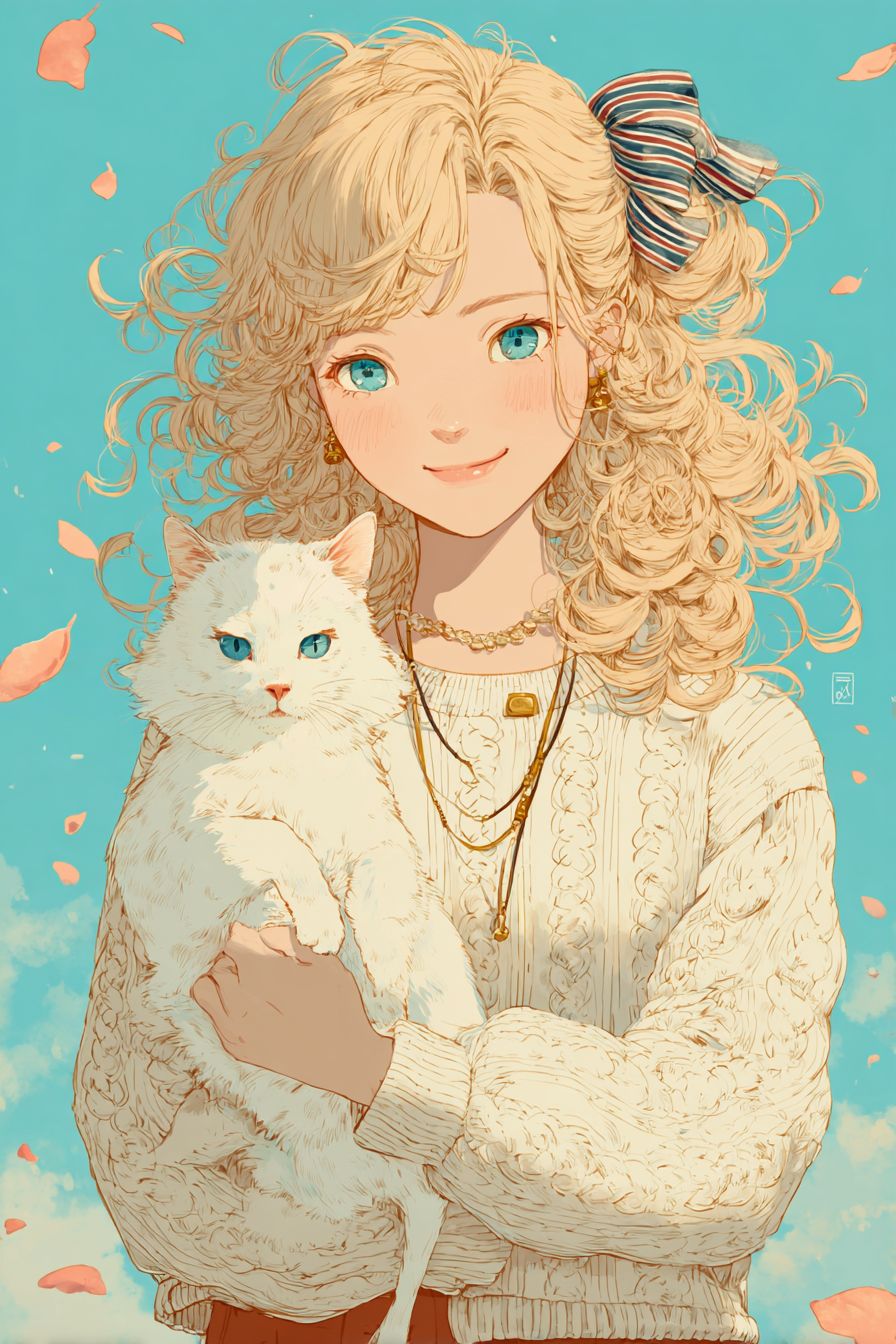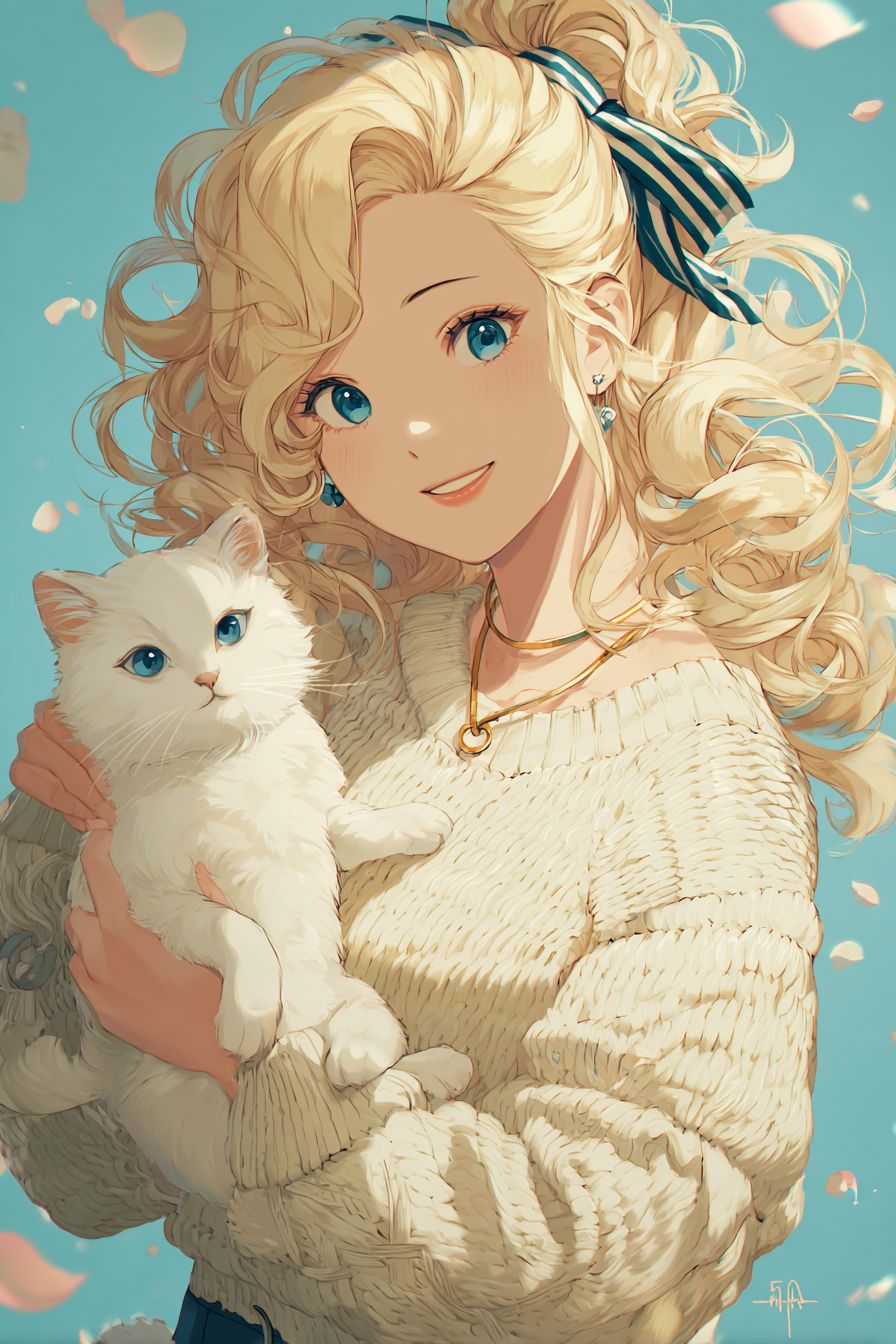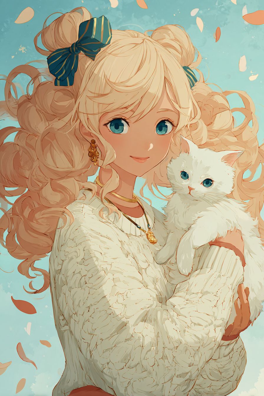 Uma menina de anime fofa com cabelos loiros cacheados volumosos amarrados com uma fita listrada, segurando um gato branco fofinho com olhos azuis, vestindo um suéter creme aconchegante com padrões sutis de tricô e um colar de ouro, sorriso gentil, fundo azul pastel com pétalas flutuantes.