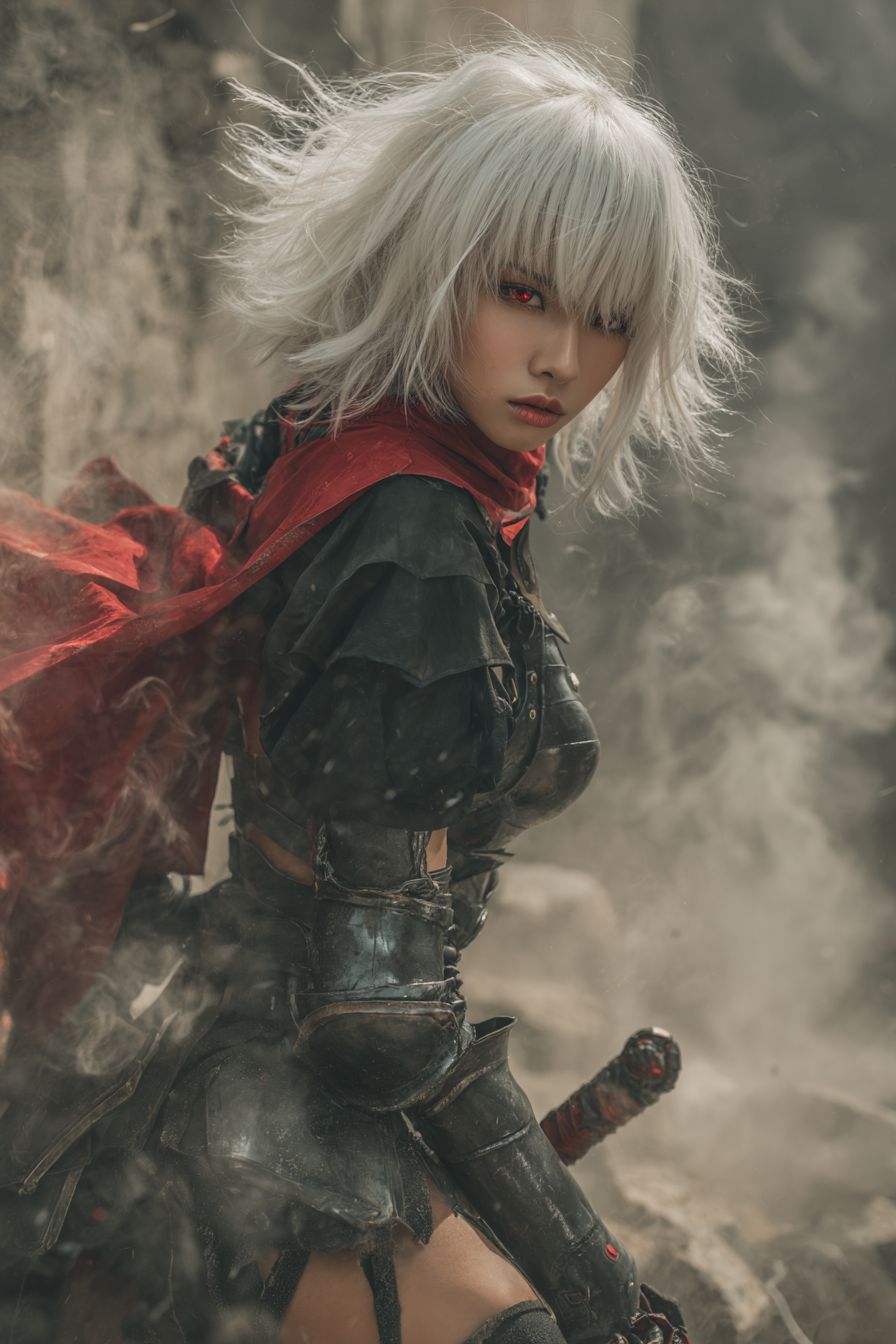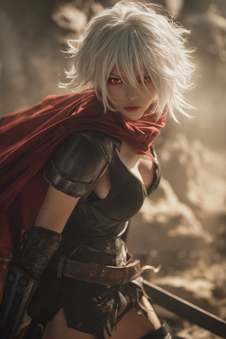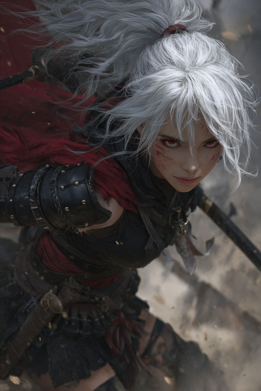 Uma garota de anime feroz com cabelo branco selvagem, olhos vermelhos intensos, vestindo uma roupa de guerreira preta com armadura de couro e uma capa vermelha, em uma pose pronta para a batalha com uma espada, cenário de um campo de batalha com fumaça e ruínas.