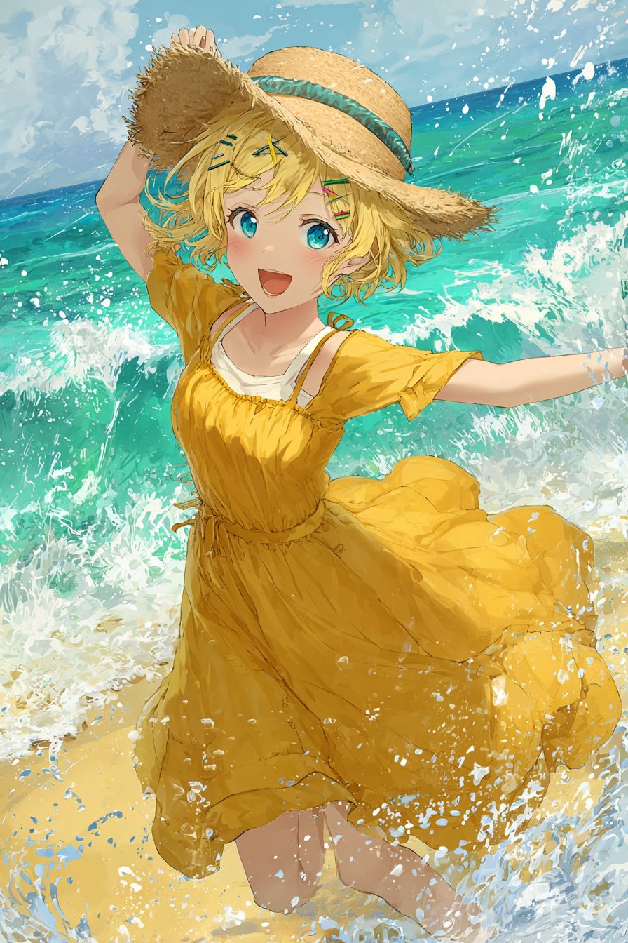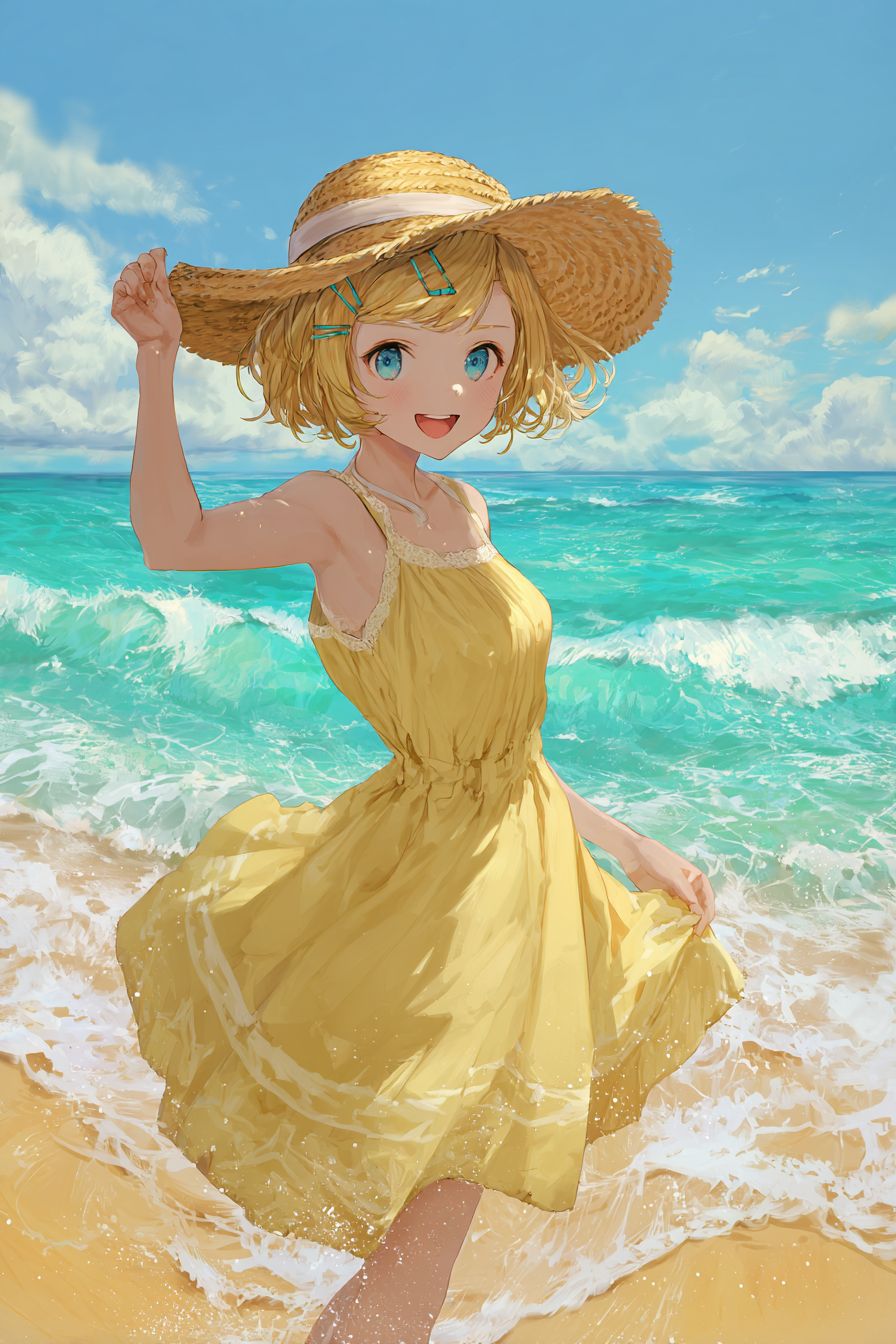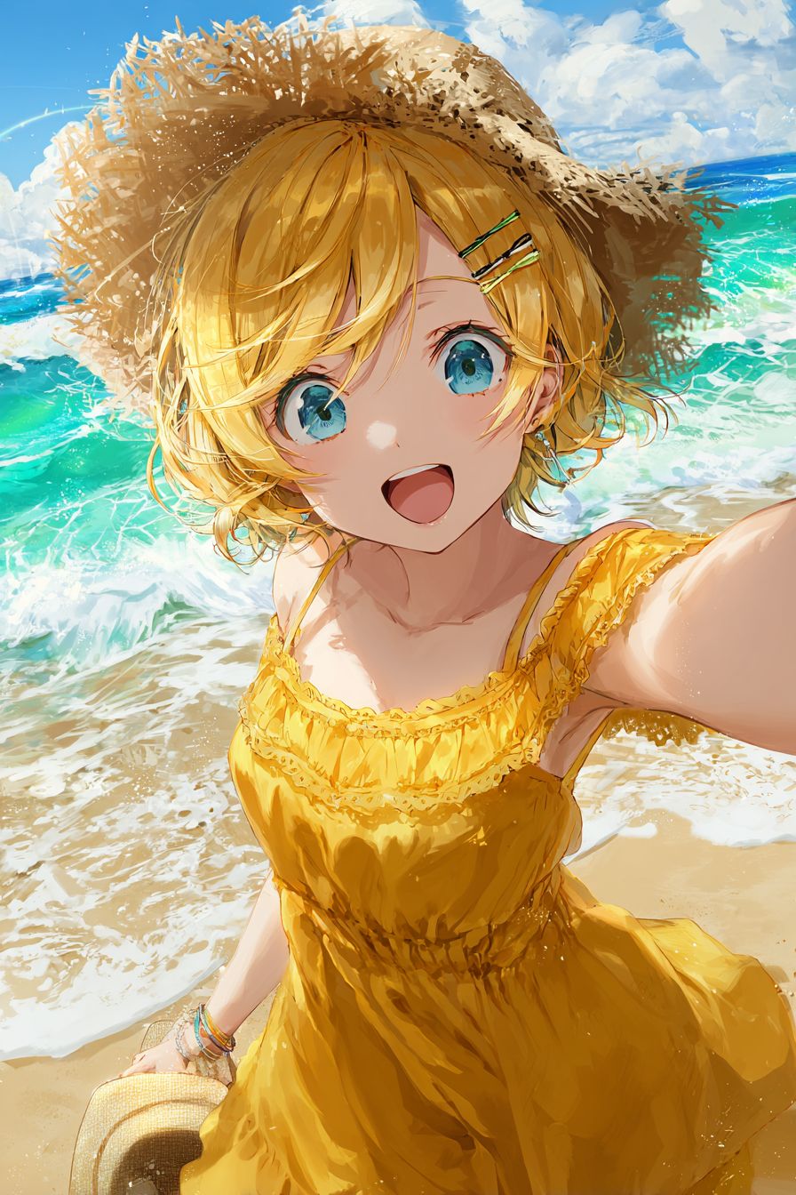 Uma animada garota de anime com cabelo amarelo curto e clipes, olhos azuis cheios de alegria, vestindo um vestido de verão amarelo e um chapéu de palha, cena de praia com areia dourada e ondas turquesa, clima ensolarado