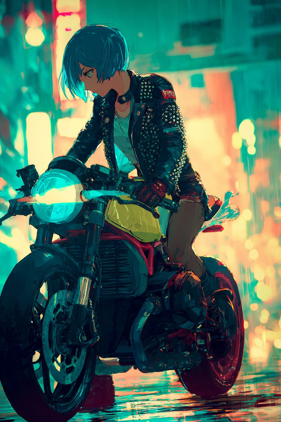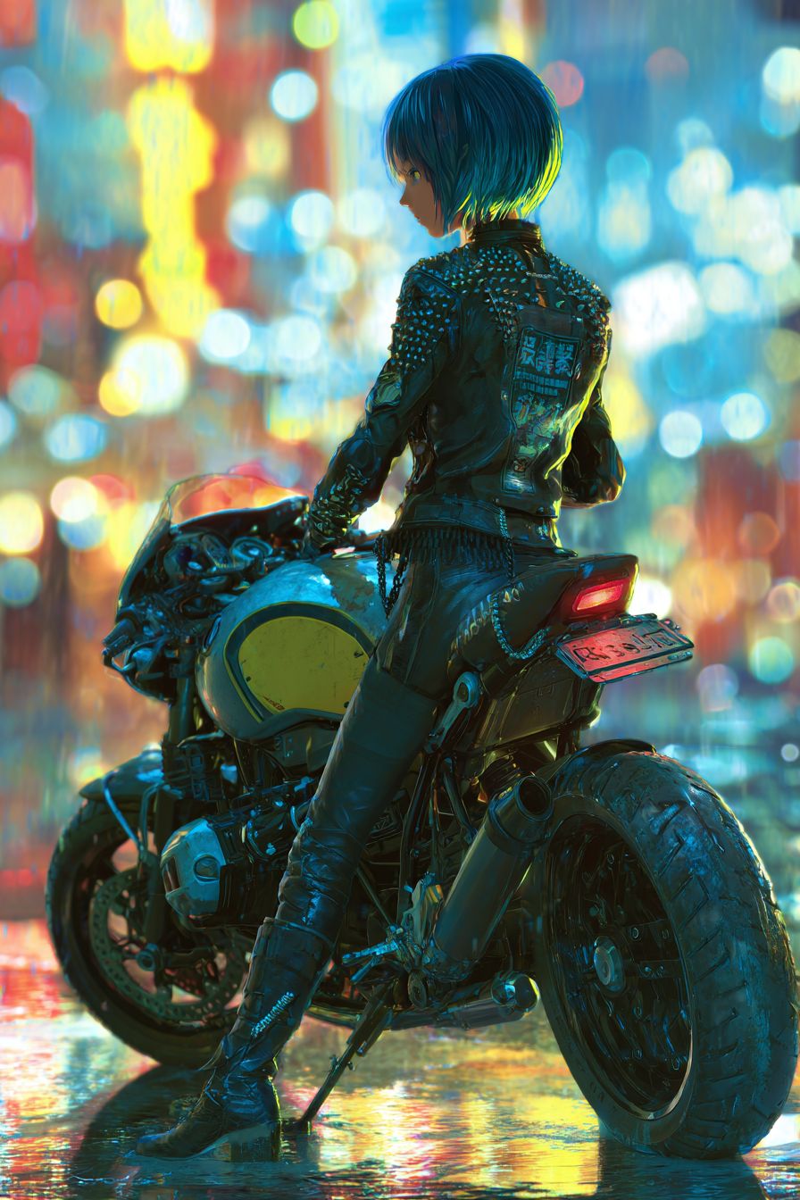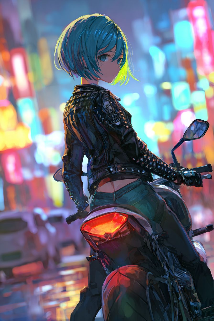 Uma garota de anime legal com cabelo curto azul com camadas de neon, vestindo uma jaqueta de couro preta com tachas, andando em uma motocicleta elegante, em uma cena noturna da cidade com ruas molhadas e reflexos coloridos.