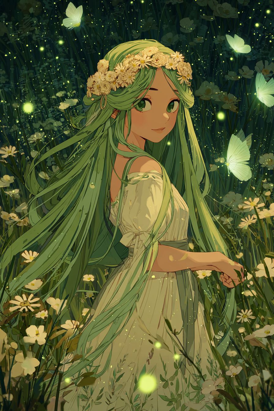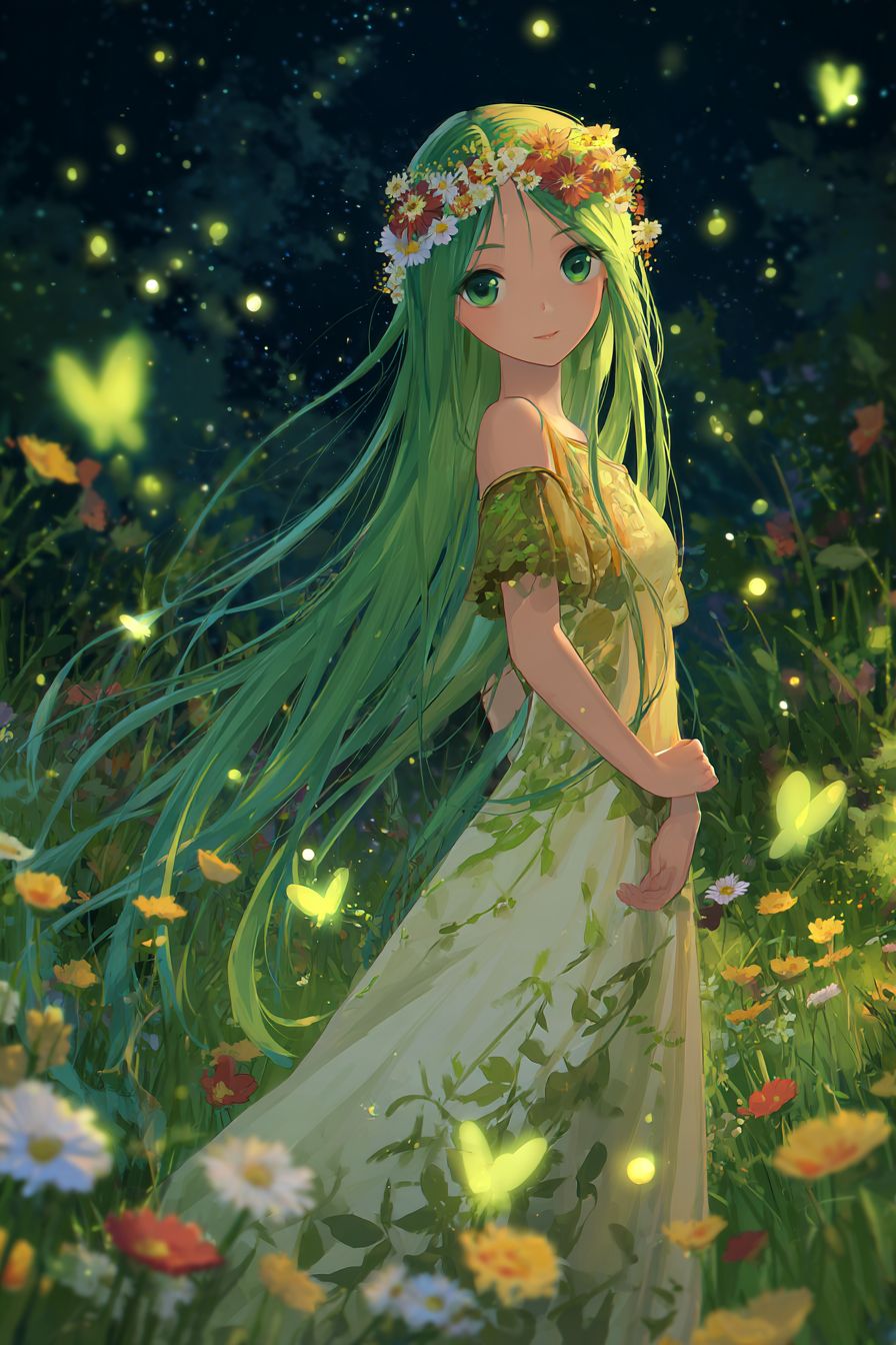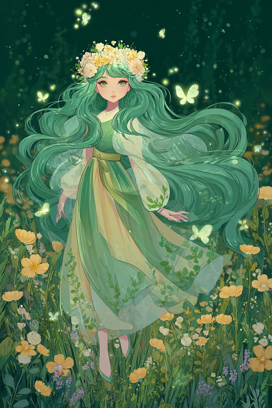 Uma garota de anime excêntrica com cabelos verdes longos adornados com uma coroa de flores, vestindo um vestido fluido com padrões de folhas, em um prado com flores silvestres, cercada por pequenas fadas brilhantes.