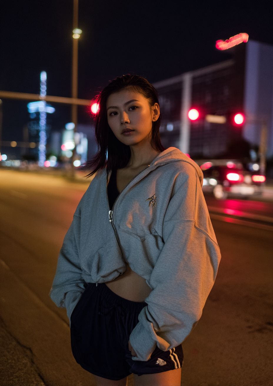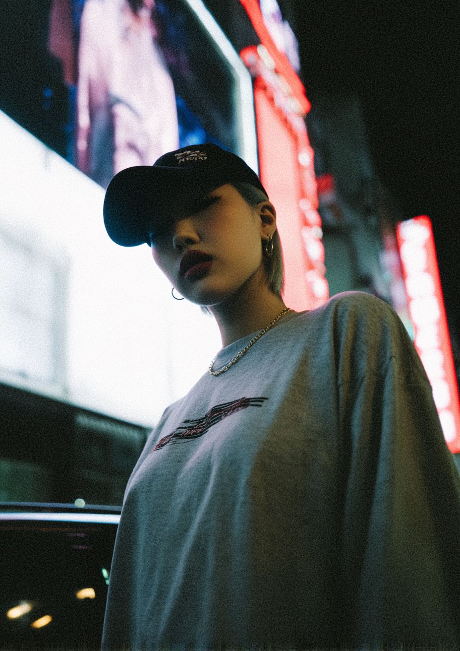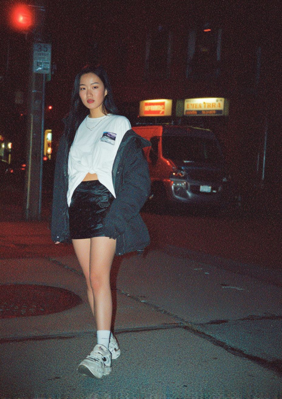 Foto realista de um modelo asiático oriental vestindo roupas de rua, capturada com a Contax T2 com flash em uma cena urbana, muito real e autêntica.