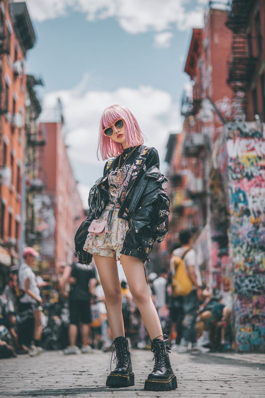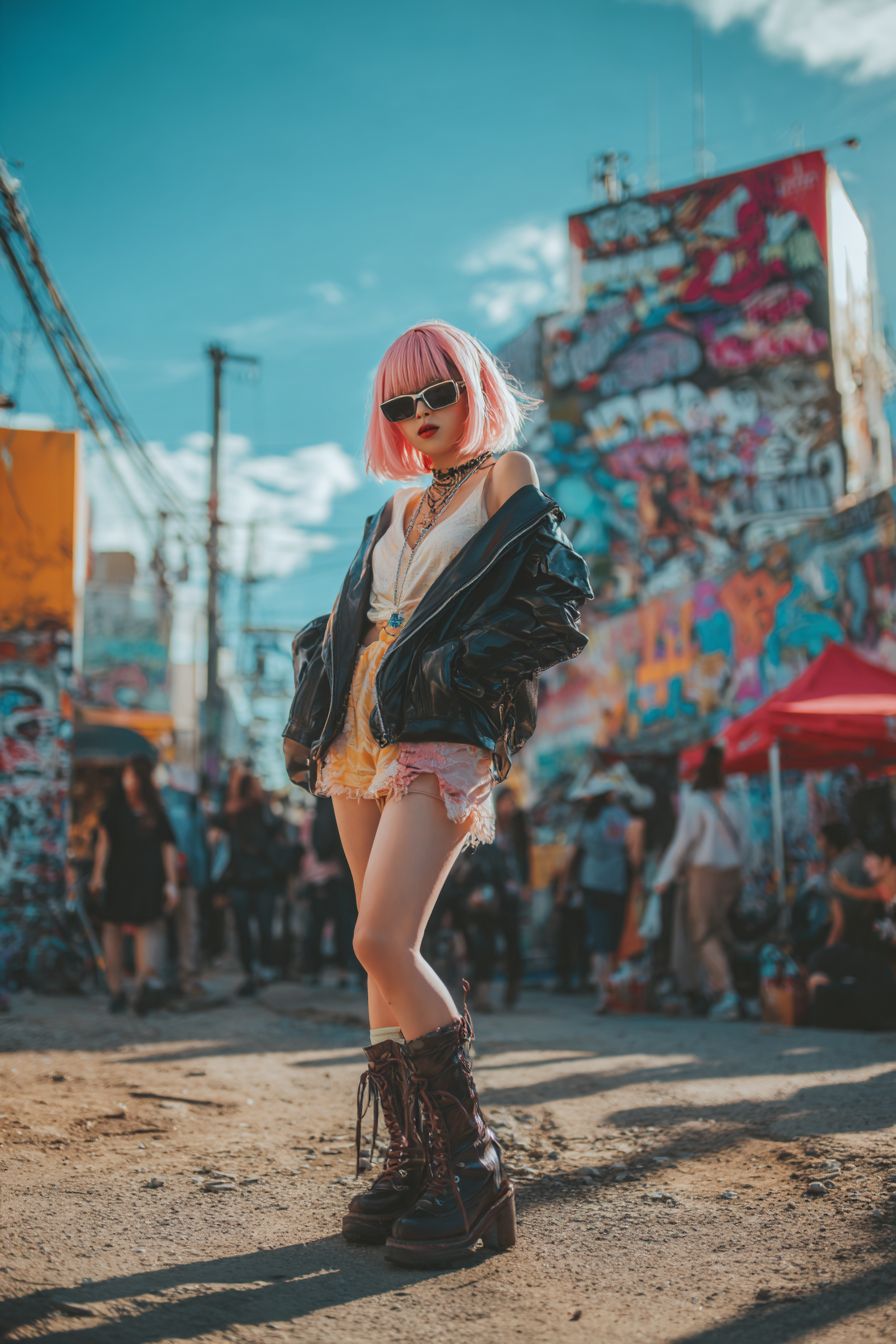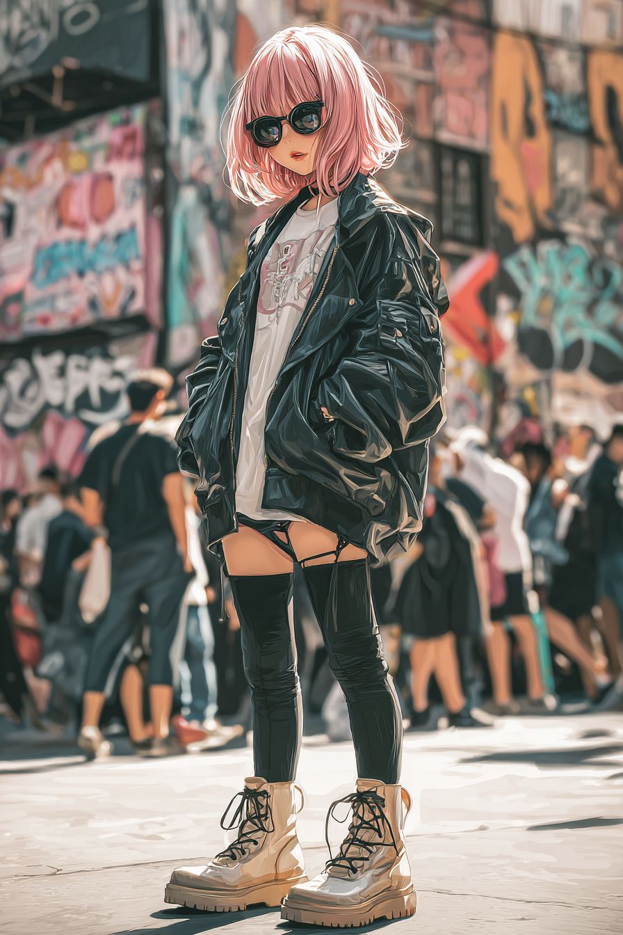 一个时尚的动漫女孩,粉色的短发带刘海,佩戴着超大太阳镜,穿着时髦的服装,搭配皮夹克和靴子,背景是充满涂鸦和熙熙攘攘人群的城市街道。