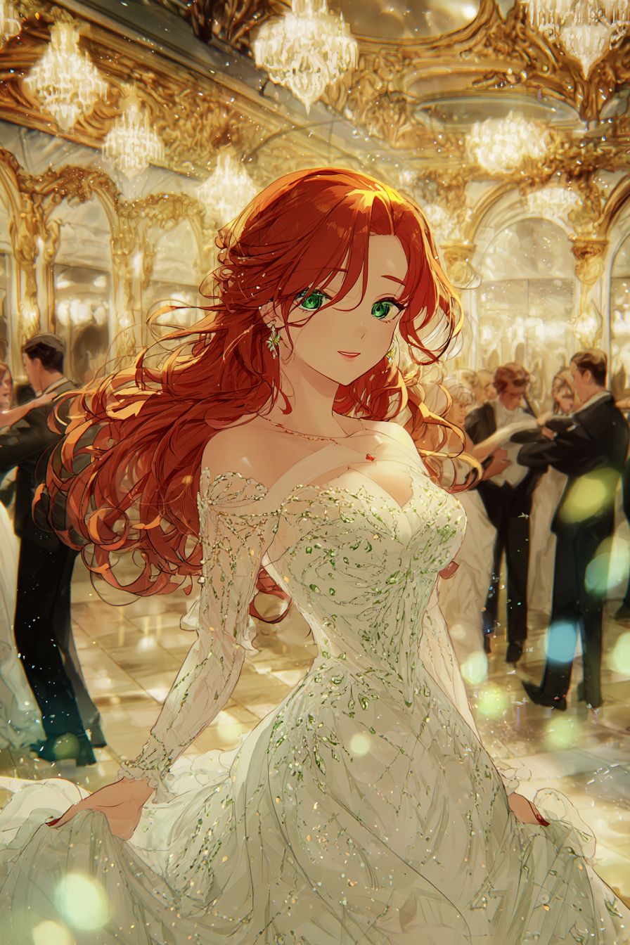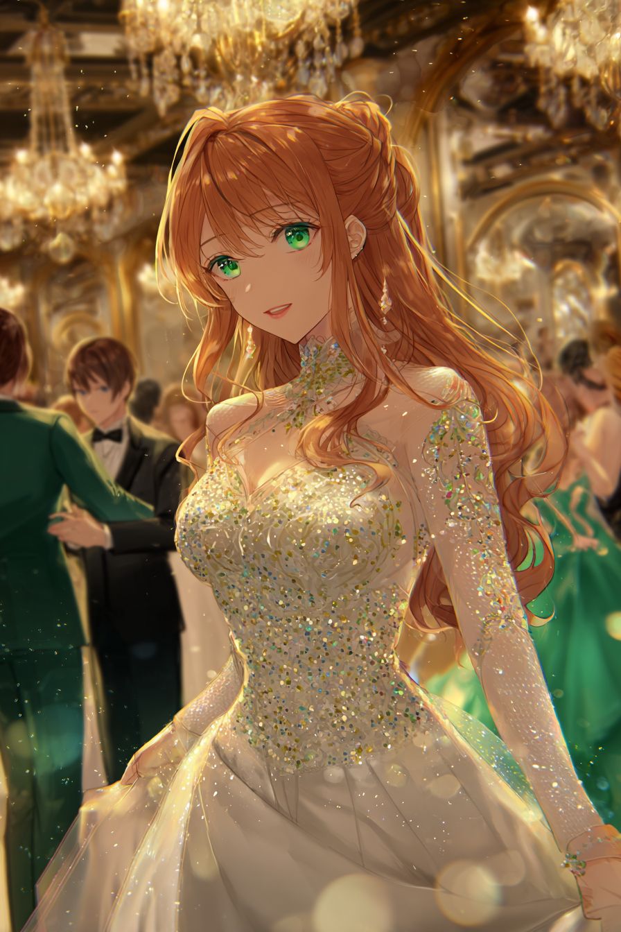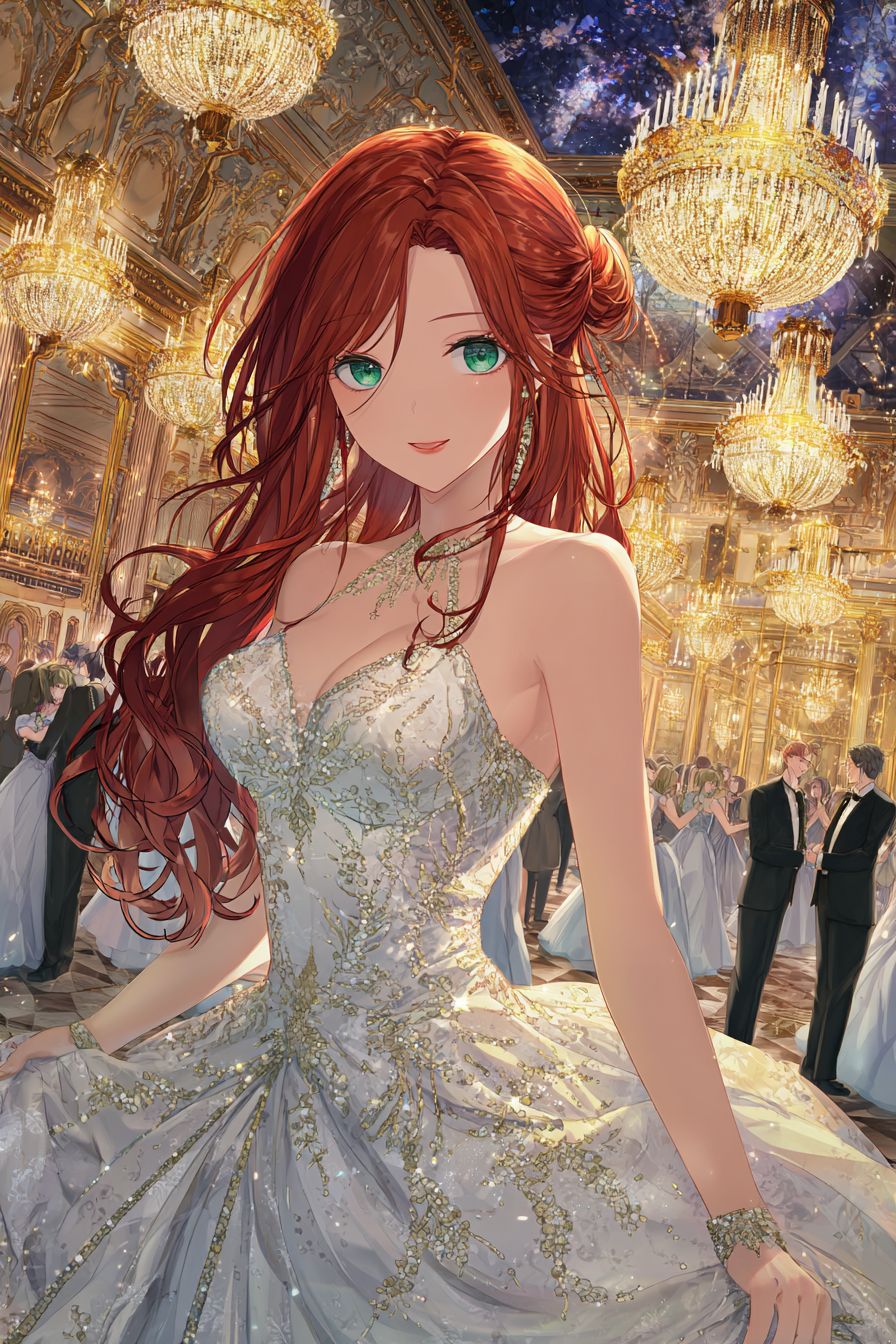 一個優雅的動漫女孩,長長的紅髮帶有金色條紋,綠色的眼睛閃爍著光芒,身穿帶有亮片細節的舞會禮服,燈光璀璨的大廳裡跳舞的情侶和華麗的鏡子。